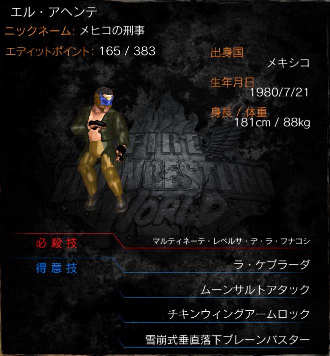 | 得意技 | ラ・ケブラーダ ムーンサルトアタック チキンウイングアームロック 雪崩式垂直落下式ブレーンバスター |