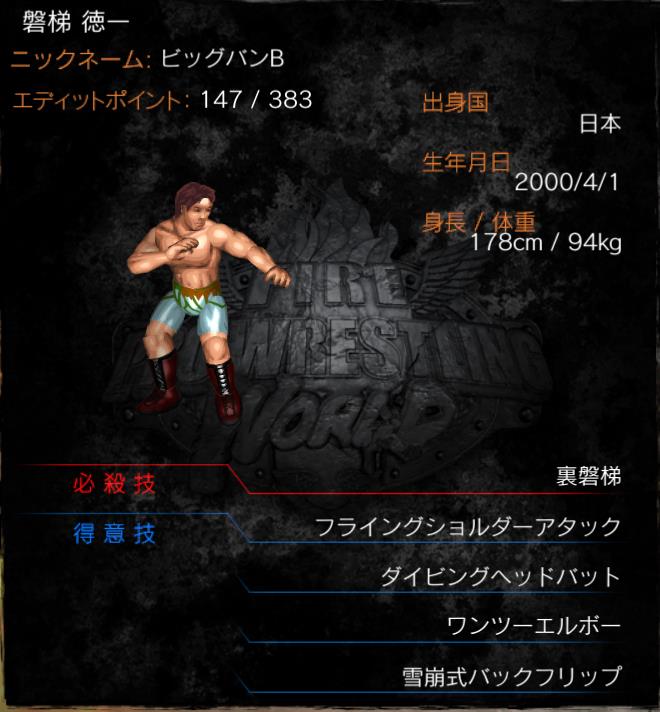 | 得意技 | フライングショルダーアタック ダイビングヘッドバッド ワンツーエルボー 雪崩式バックフリップ |