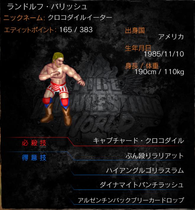 | フロリダから来た暴れん坊。本人曰く「ワニを捕まえて食ってる」というパワーが武器で、 腕っ節に任せて殴って投げて締め上げるラフ&パワーファイトで会場を沸かせている。 ワニを絞り上げるとばかりに全身を絞る必殺技は驚異だが、暴れ出すと止まらないためその隙を突かれて勝負を落とすこともあり、 安定性に欠けることから評価が安定しないというきらいもある。 【クラフト技使用】 |