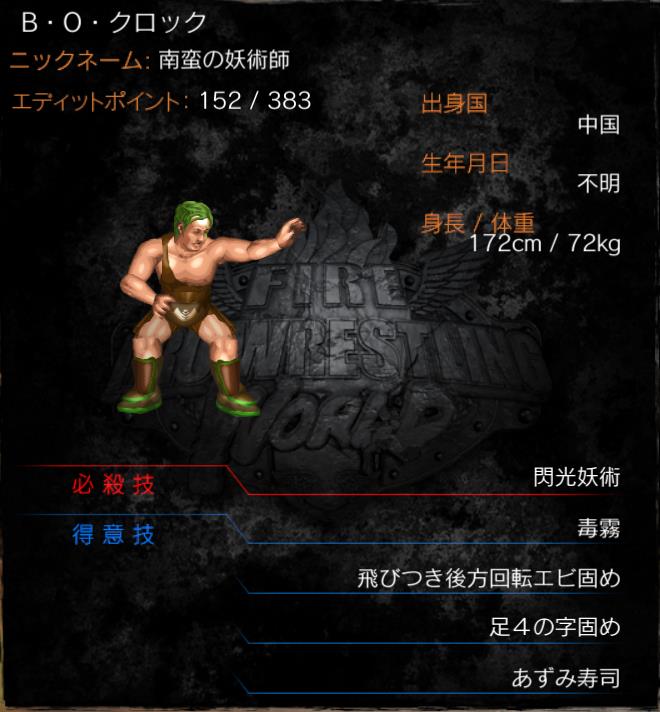 | 得意技 | 毒霧 飛びつき後方回転エビ固め 足4の字固め 饅頭(あずみ寿司) |