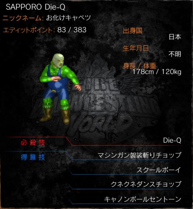 | 得意技 | 千切り (マシンガン袈裟斬りチョップ) スクールボーイ 虫(クネクネダンスチョップ) キャノンボールセントーン |