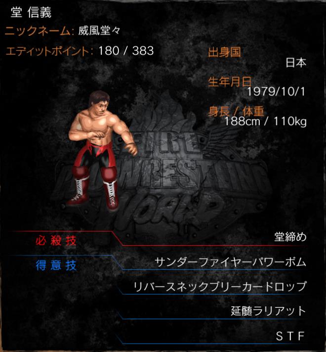 | 得意技 | 拷問ヘッドロック 堂式首折り落とし (リバースネックブリーカードロップ) →コウモリ吊りに変化すると 「堂式首折り落とさず」 延髄ラリアット 裏堂締め (STF) |