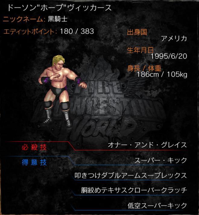 | ドノヴァンの愛弟子であり、ドノヴァン・FUJIKAWAの両名からトレーニングを受けている有力株。 そのコスチュームと雰囲気から「黒騎士」と呼ばれる。必殺技は高角度のDDT。 アメリカでも大刈涼平と熱戦を繰り広げた、時代の大器。 |