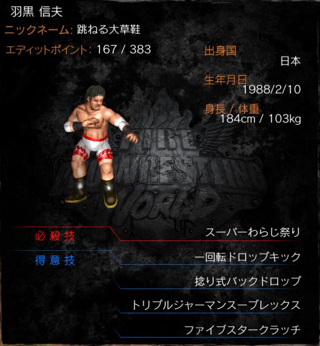 | 得意技 | わらじ祭り(一回転ドロップキック) 岩谷落とし(捻り式バックドロップ) 信夫三山(トリプルジャーマンスープレックス) 信夫山クラッチ(ファイブスタークラッチ) |