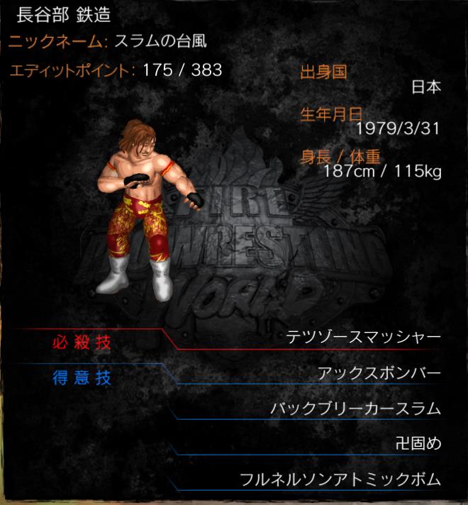 | 必殺技 | テツゾースマッシャー (旋回式スパインバスター) |