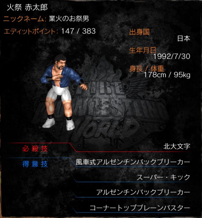 | 得意技 | 風車式アルゼンチンバックブリーカー スーパーキック アルゼンチンバックブリーカー 火祭トーチ (コーナートップブレーンバスター) |