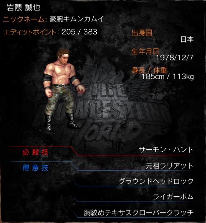 | 必殺技 | サーモン・ハント (元祖ラリアット) |
