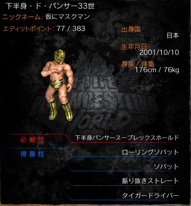 | 必殺技 | 下半身パンサースープレックスホールド (タイガースープレックスホールド) |