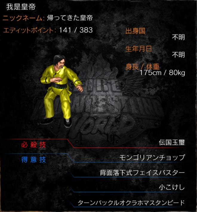 | 突如Impuct!!リングに登場した謎の(自称)皇帝。「ウォシィファンディ」と読む。 「元々は日本人だったが、事故で古代中国に転生して皇帝となり、再度現代に転生してきた」と語る 3度手間のエピソードを語っている。(誰も信用していない)ので、もう日本語は忘れてしまったとか。 技名に中国に由来のあるものを多くそろえ、このリングでも皇帝を目指す。 白人の執事がいたが、はぐれてしまったらしい。 |