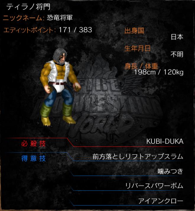 | 東京の博物館にあるティラノサウルスの骨格図に何者かが取り憑き人間の姿となって歩き出した …らしい。 現在博物館にある骨格図は何者かがすり替えたとのことだが、詳細は不明。 恐竜のパワーと、「何者か」の巧みなダーティファイトが持ち味だが、 必殺技のダイビングヘッドバッドは巨体からは想像できない飛距離を持つ。 一説によると京都から東京までは飛べるらしい。 |