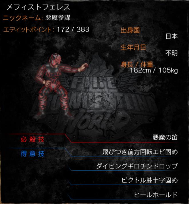 | 正体不明の覆面レスラーで、反則殺法を得意とする。 必殺技の「悪魔の笛」は、相手を受け身が取れない体勢から真っ逆さまに落とす大技。 インセイン・ムーンサイドに所属していたが、SINとともに造反。レヴェナントに加入した。 反則殺法の影に隠れた関節技のキレから、格闘技出身の選手であるとも噂される。 なお、彼の話術によってレヴェナントに導かれた者も多いとか。 |