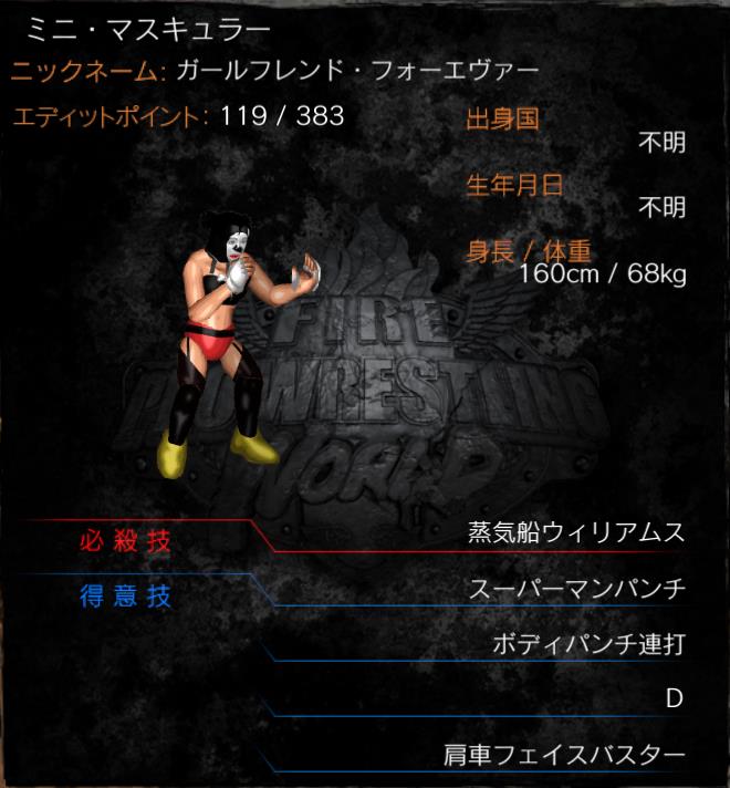 | 得意技 | スーパーマンパンチ ボディパンチ連打 エレクトリカルチェアー (肩車フェイスバスター) D |