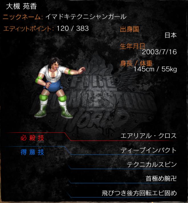 | 得意技 | ディープインパクト テクニカルスピン 首極め腕卍 飛びつき後方回転エビ固め |