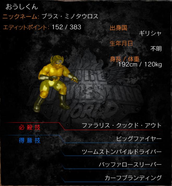 | (自称)ギリシャから2021年の日本にやってきた(自称)縁起物。 曰く(自称)真鍮製の肉体で、オリハルコンの正体と目されている(本人談) 体温が高いらしく、その体温のせいで火を吹く(本人談)。 また、必殺のフライングボディシザースはしっかりとマットと密着することにより、本人の体温の高さもあり 高温で炙られているような錯覚に陥るらしい(本人談) 本当はイタリアが故郷らしい(本人談) |