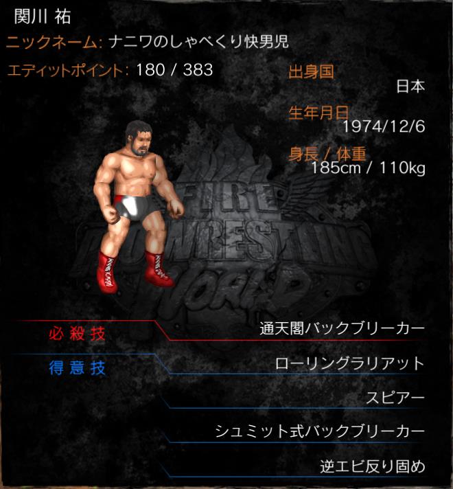| 得意技 | ローリング通天閣 (ローリングラリアット) スピアー シュミット式バックブリーカー 逆エビ反り固め |
