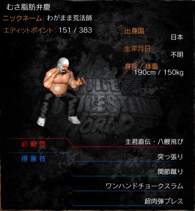 | 必殺技 | 主君直伝・八艘飛び (スーパーヘビーダイビングボディプレス) |