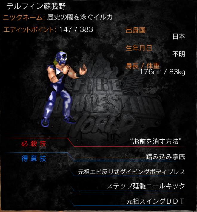 | 必殺技 | "お前を消す方法" (胴締めチョークスリーパー) |