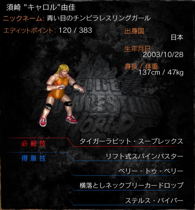 | 必殺技 | オレンジ・ブラック・スープレックス (高角度タイガースープレックス) |