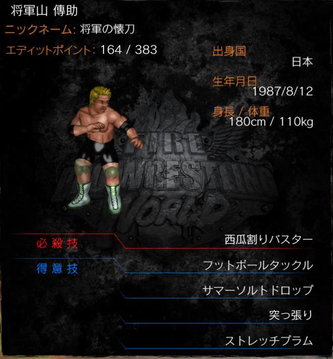 | 得意技 | ぶちかまし(フットボールタックル) 西瓜落とし(サマーソルトドロップ) 突っ張り トーマ・ダンジョン(ストレッチプラム) |