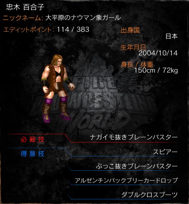| 女子高生レスラーで、身長は低いながらも重心も低いというパワーファイトに適した体躯を持っている。 得意技は見ての通りのパワー殺法だが、特に倒れた相手を無理矢理引き起こして決めるブレーンバスターには一見の価値がある。 普段は寝ている。ひたすら寝ているため、「冬眠」と呼ばれる事もあるが、 リングに上がればナウマン象のごとく覚醒する。 好物は百合根。親に自分の名前を感謝するほど好き。 【クラフト技使用】 |