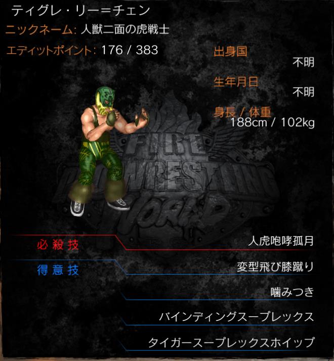 | 得意技 | 襲叢脚(変形飛び膝蹴り) 噛みつき バインディングスープレックス タイガースープレックスホイップ |