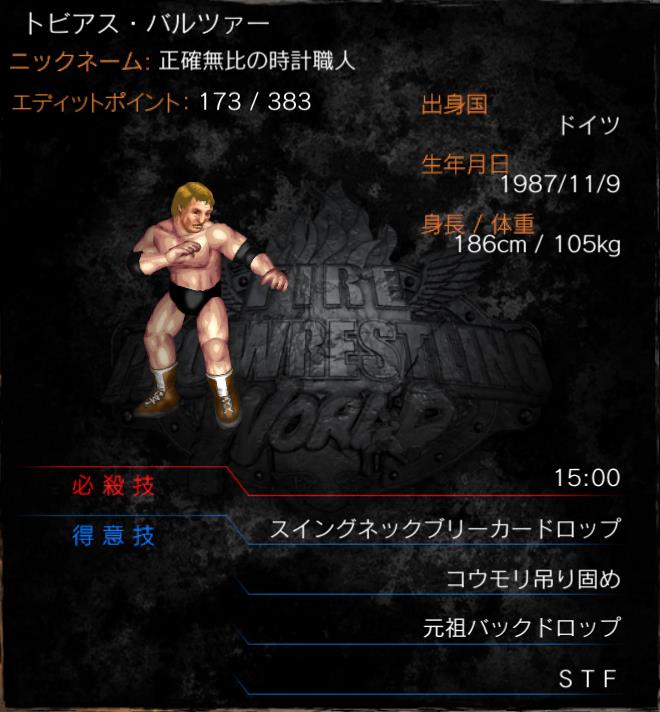 | 「ドイツの業師」と呼ばれる職人肌のレスラー。地味だが確かな技術が武器。 堅実な首狙いから、技をかけるときの体勢に由来する必殺技で仕留める。 欠場が少ないことでも有名。 |