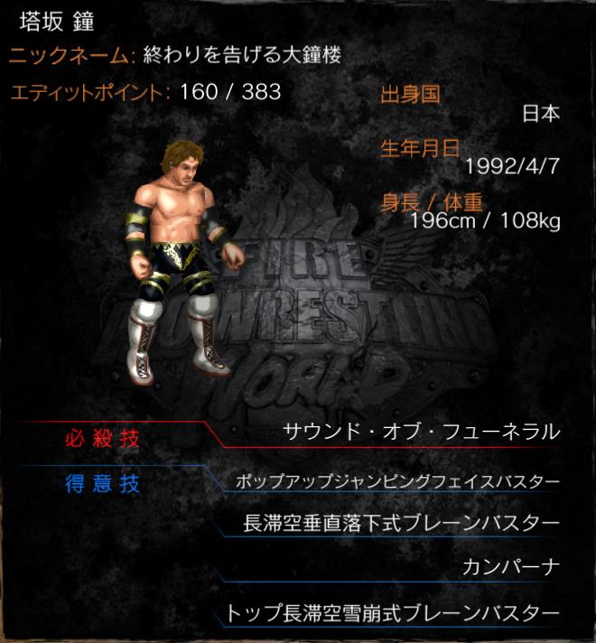 | 得意技 | ポップアップジャンピングフェイスバスター 長滞空垂直落下式ブレーンバスター 大鐘楼(カンパーナ) オモイカネ (トップ垂直落下式ブレーンバスター) |