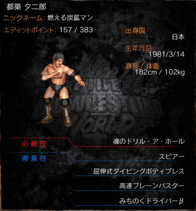 | 得意技 | スピアー 屈伸式ダイビングボディプレス 高速ブレーンバスター 雪山大返し (みちのくドライバーβ) |