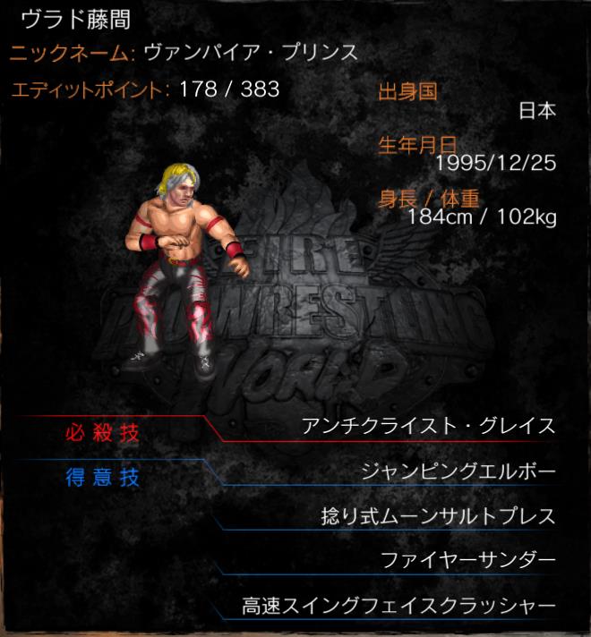 | 必殺技 | アンチクライスト・グレイス (チキンウイングパイルドライバー) |